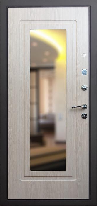Эта модель создана для тех, кто ценит не только прочность, но и практичность в повседневном использовании. Стальной каркас из профильной трубы и лист металла толщиной 2 мм с рёбрами жёсткости формируют надёжную основу, способную выдерживать серьёзные нагрузки. Снаружи дверь защищена порошковым покрытием, которое устойчиво к влаге, солнцу и механическим повреждениям, а изнутри отделана МДФ-накладкой, придающей интерьеру уют и аккуратность. В центре конструкции внимание привлекает зеркало — удобная деталь, которая избавляет от необходимости в дополнительном настенном аксессуаре и одновременно делает пространство визуально просторнее. Именно здесь название модели — металлическая дверь с зеркалом в дом №2 — обретает своё значение, сочетая функциональность с эстетикой. Для повышения безопасности предусмотрены два замка российского производства с независимыми системами запирания, а также блокираторы. Два контура уплотнителя защищают от сквозняков и пыли, а возможность выбрать направление открывания делает установку универсальной. Металлическая дверь с зеркалом в дом №2 от производителя: быстрое изготовление и монтаж в Домодедово, индивидуальные размеры, широкий выбор материалов и фурнитуры, официальная гарантия до 10 лет.
