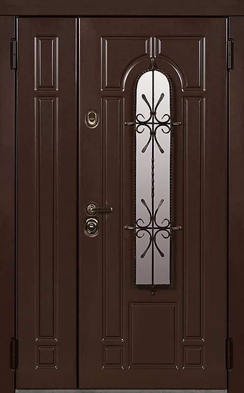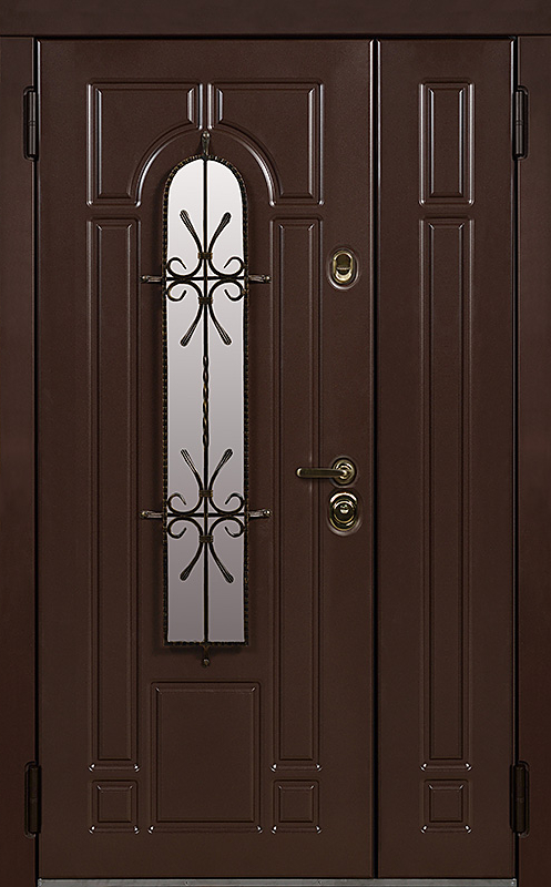Эта металлическая двухстворчатая дверь с арочным стеклопакетом №15 представляет собой идеальный баланс между эстетикой и прочностью. Арочное стекло добавляет в её дизайн утончённость, а ковка в декоре придаёт изысканный, но в то же время крепкий и надёжный вид. Плита МДФ, используемая как для внешней, так и для внутренней отделки, не только сохраняет прекрасный внешний вид, но и устойчива к механическим повреждениям. Металлическая двухстворчатая дверь с арочным стеклопакетом №15 от производителя: быстрое изготовление и монтаж в Домодедово, индивидуальные размеры, широкий выбор материалов и фурнитуры, официальная гарантия до 10 лет.