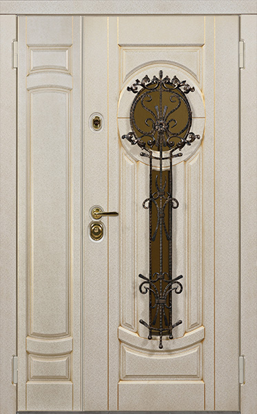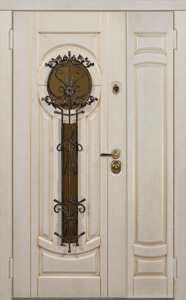 Двухстворчатая парадная дверь с ковкой и стеклом белая №30 — это сочетание красоты и надёжности. Конструкция из профильной трубы 50х25 мм и металлического листа толщиной 2 мм обеспечивает долговечность и стойкость к внешним воздействиям. Элементы ковки придают двери изысканный вид, а стеклопакет позволяет создать атмосферу лёгкости и прозрачности. Внешняя и внутренняя отделка выполнены из плиты МДФ, что делает дверь не только привлекательной, но и устойчивой к механическим повреждениям. Для дополнительной герметичности используются уплотнители с двумя контурами, а блокираторы обеспечат безопасность. Вариативность размеров и возможность добавления дополнительных опций, таких как шумо- и теплоизоляция, делают эту модель универсальной для установки в любом интерьере. Двухстворчатая парадная дверь с ковкой и стеклом белая №30 от производителя: быстрое изготовление и монтаж в Домодедово, индивидуальные размеры, широкий выбор материалов и фурнитуры, официальная гарантия до 10 лет.