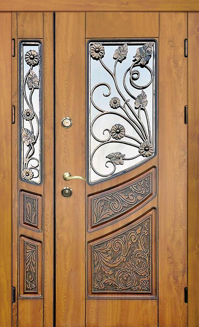 Дверь со стеклопакетом входная №411 создана для тех, кто ценит надежность и одновременно хочет подчеркнуть стиль фасада своего дома. Прочный стальной каркас из профильной трубы с листом металла толщиной 2 мм и системой ребер жесткости гарантирует долговечность и защиту от внешних воздействий. Панели из натурального дерева с обеих сторон придают полотну благородный облик, устойчивый к царапинам и погодным перепадам, сохраняя первоначальный вид долгие годы. Стеклопакет не только украшает дверь, но и наполняет прихожую естественным светом, создавая уют и ощущение открытости. Два контура уплотнителей предотвращают сквозняки и влагу, а встроенные блокираторы усиливают защитные функции. Такая модель удачно совмещает декоративность и практичность, делая парадный вход в коттедж или частный дом одновременно безопасным и выразительным. Дверь со стеклопакетом входная №411 от производителя: быстрое изготовление и монтаж в Домодедово, индивидуальные размеры, широкий выбор материалов и фурнитуры, официальная гарантия до 10 лет.